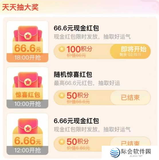 2、天天抽大奖:每天限时开抢,金额不同开始时间也不一样,最低50积分可以获得6.66元或随机红包,100积分即可获得66.6元。