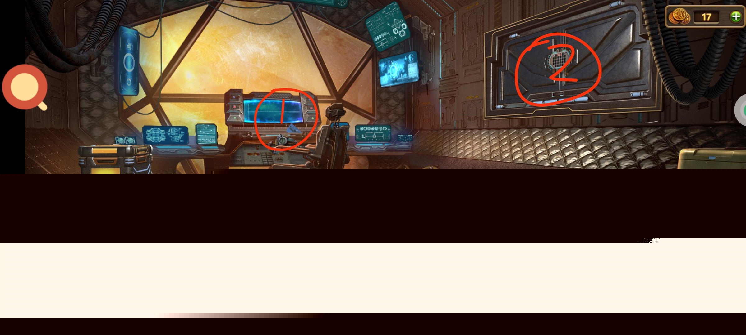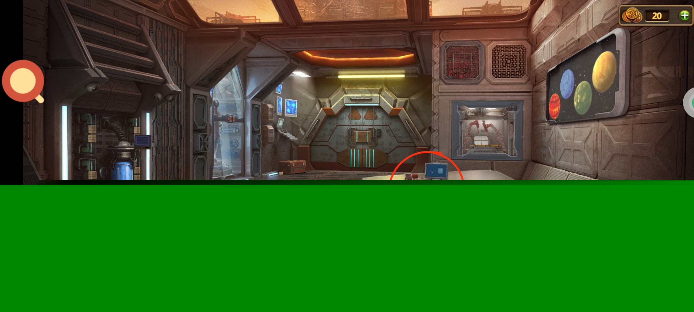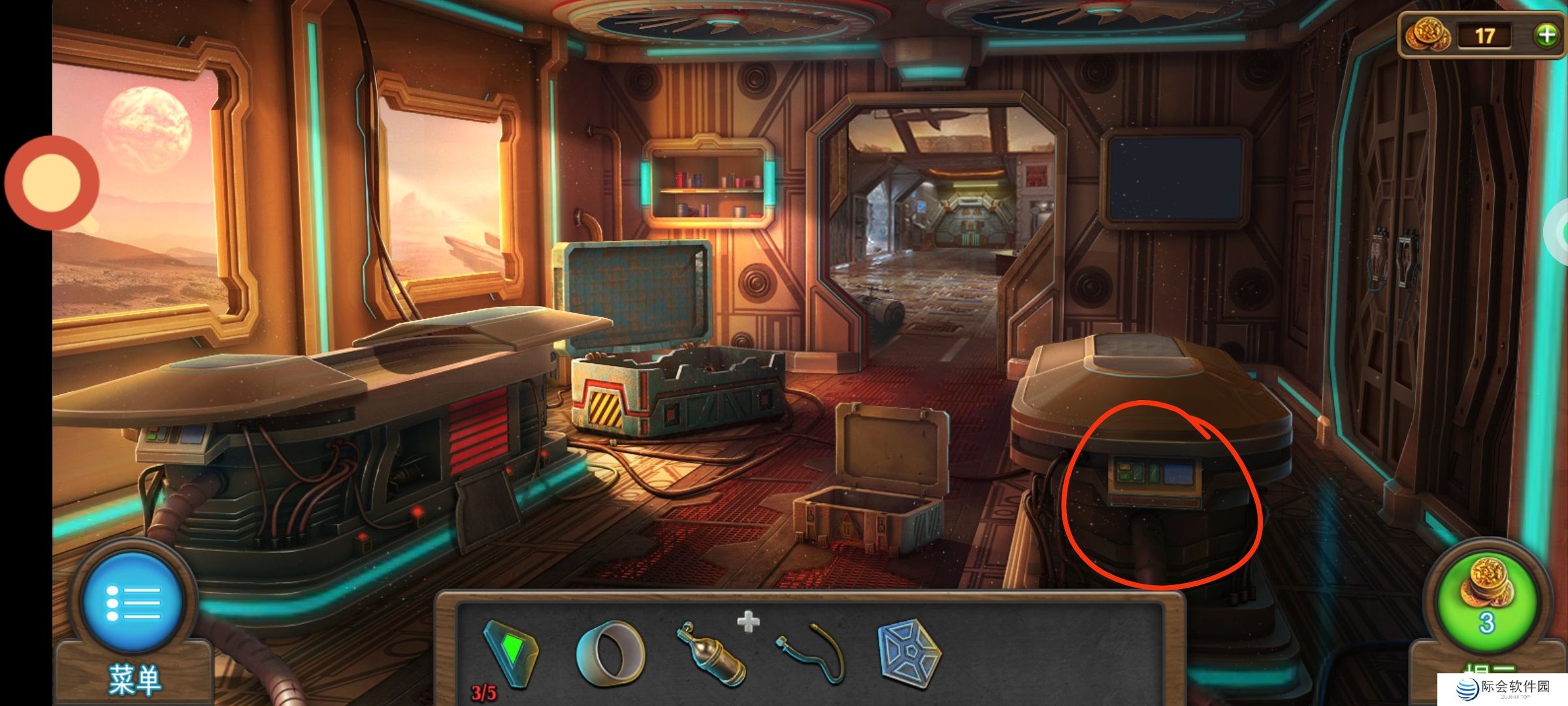 红圈处使用绿零件,完成小游戏。穿上太空服进入场景3。