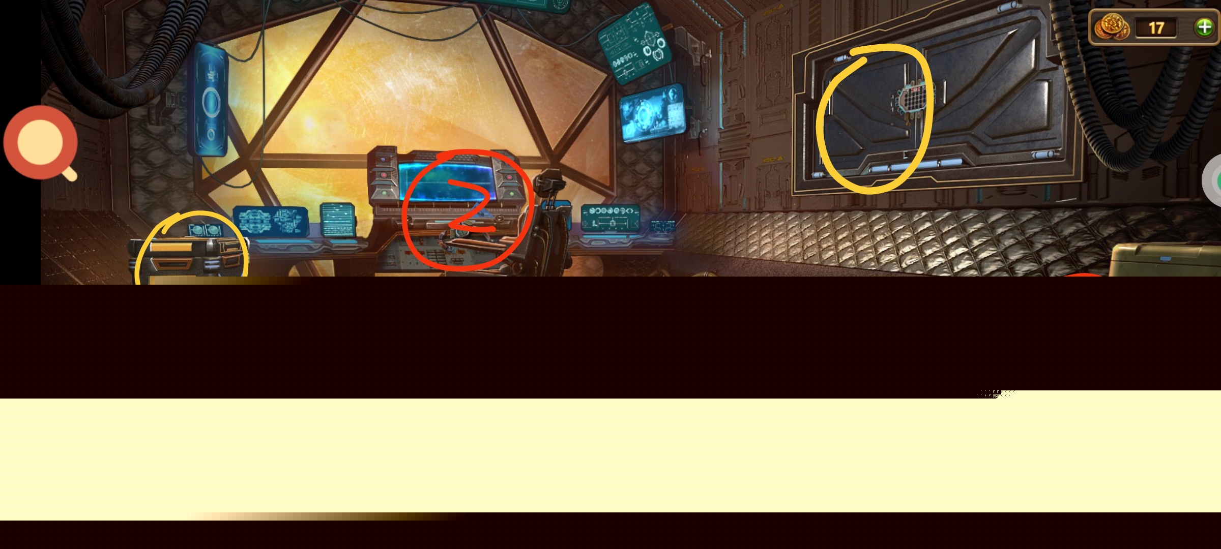 进入飞机,❶红圈1处用扫描器扫描,得到:带数据的扫描器。❷红圈2处用零件,完成小游戏,得到:把手。右上角数字69561记一下。