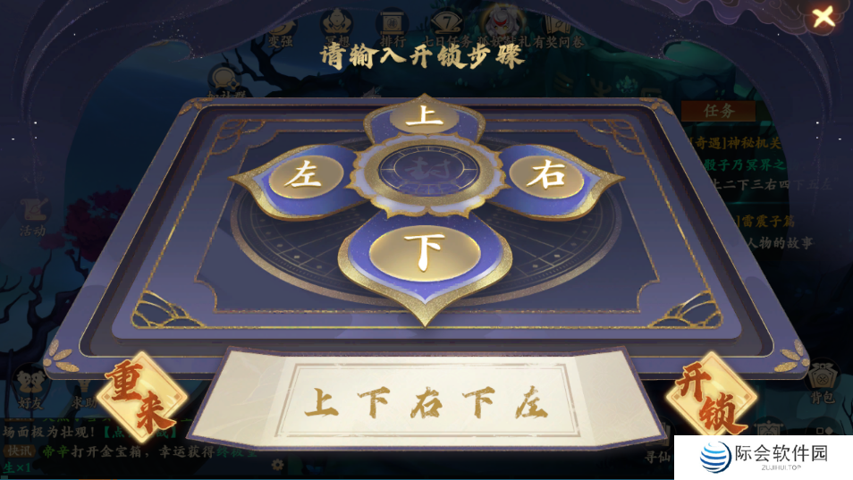 3、对话后按照“上下右下左”的顺序点击对应的图标输入,最后点击开锁即可
