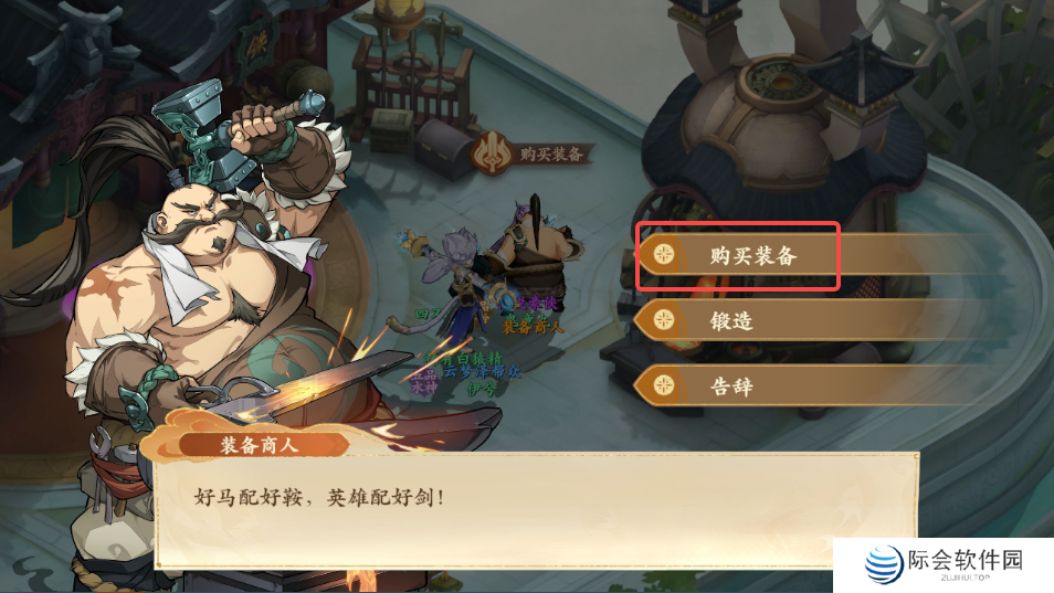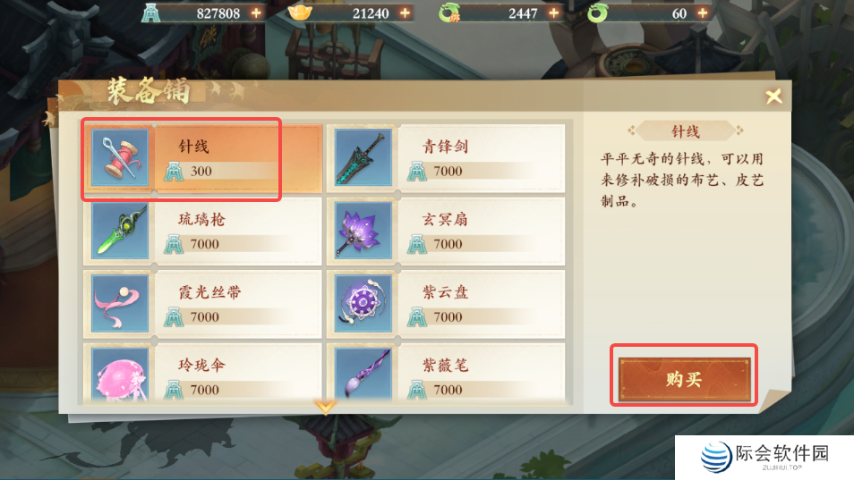 3、拾取后前往西岐如图所示装备商人处,与其对话后选择购买装备,购买针线