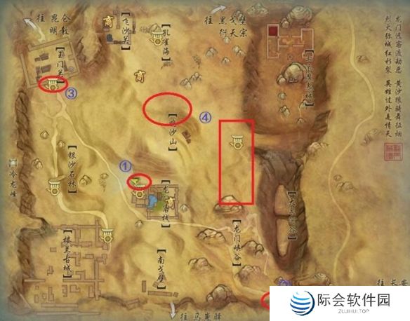 道具大概点位:龙门客栈车夫点附近、玉门关关字神行点附近(门口石台)、鸣沙山与孔雀海中间的动物骸骨旁、右下角长安车夫点附近