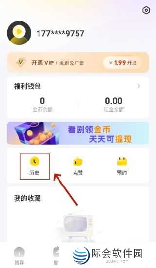 想要删除星芽短剧历史记录,就需要先完成手机号登录,之后,点击“历史”,进入“观看历史”界面。