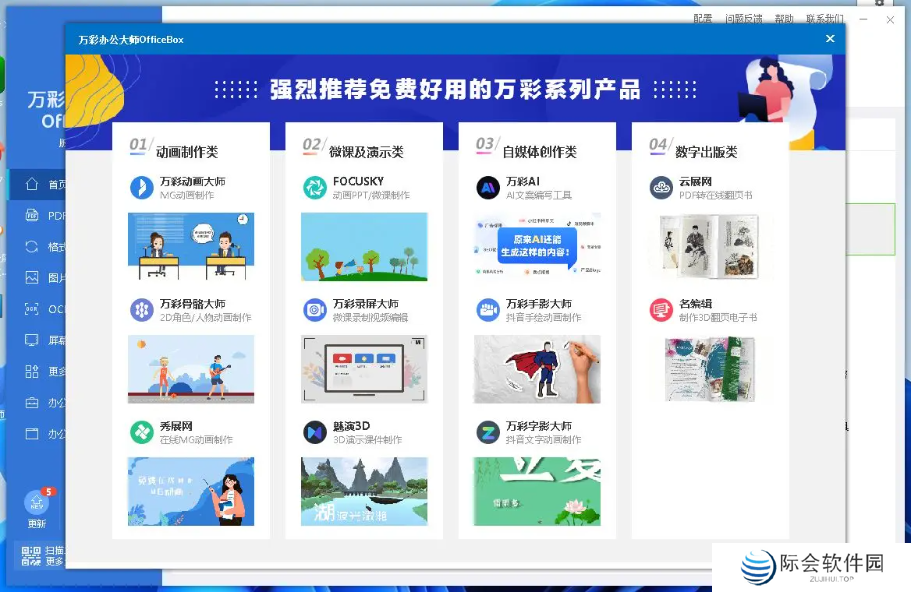 万彩办公大师OfficeBox是一款由广州万彩信息技术有限公司研发的免费办公工具软件超级套装,几乎可以满足日常各种办公工具需求。它内置了60多款强大的,无任何广告及插件的绿色办公组件。所有的套装工具不需要安装,直接可以绿色加载启动,省去了用户为安装各种办公软件而寻找工具、安装及卸载的麻烦。
