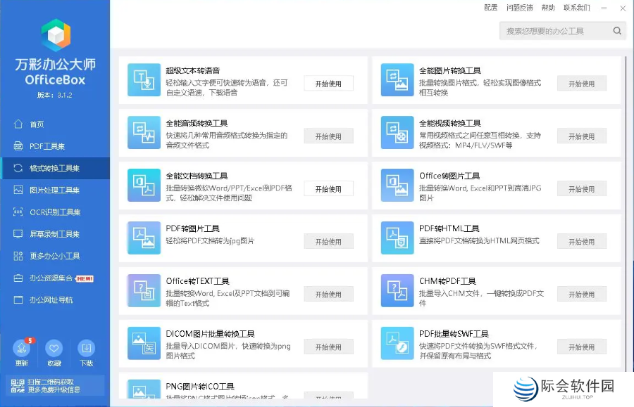 2. 格式转换套件 : 包括全能PDF转换器 (转图片,转WORD,转HTML),Office转换器(WORD/PPT/EXCEL转图片及PDF),全能图片转换工具,全能音频转换工具,全能视频转换工具, 全部支持批量转换。