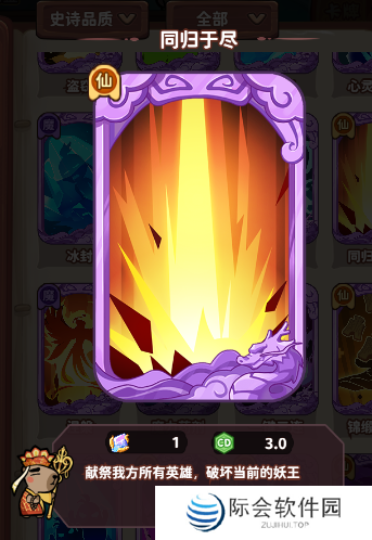 使用小技巧:前期使用就是自毁,但是对局最后的决胜关键牌。当然不是跟你的对手同归于尽,因为胜利条件是有“优先消灭妖王”这一条件的,所以在对局到最后轮次攻打妖王的时候,就可以打出这张牌,清空自己的所有英雄同时消灭妖王,而你的对手还在慢慢打!因为最后轮次后续不会再出现其他怪物,打出同归于尽后等待胜利就可以了!当然如果你的对手也携带了同归于尽,那就是拼手速的时候了!