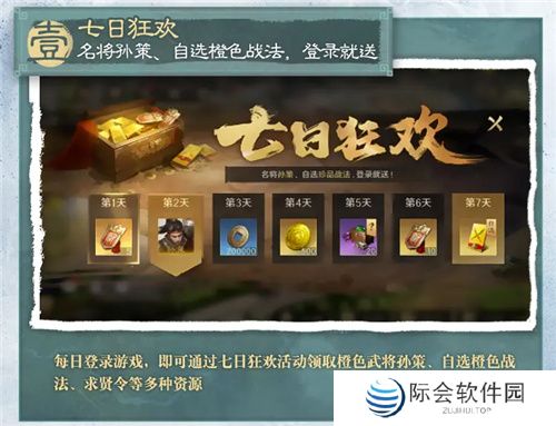 活动介绍:玩家每日登录游戏,即可通过七日狂欢活动领取【橙色武将孙策】、【自选橙色珍品战法】、【求贤令】等多种道具奖励。