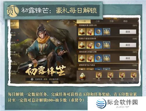 活动介绍:自开服后每日解锁一定数量任务,玩家完成任务可获得青玉印和任务奖励,青玉印数量累计至一定值可总计解锁超过100抽(求贤令)、铜币等丰厚奖励!