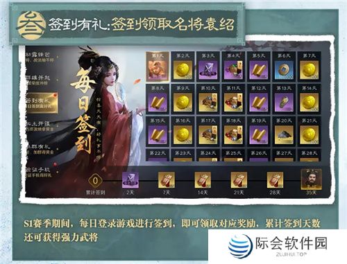 活动介绍:在公测S1赛季期间,玩家每日登录游戏进行签到,即可领取对应奖励,累计签到天数可获得【橙色武将袁绍】、【求贤令】、【黄金】及海量养成材料。