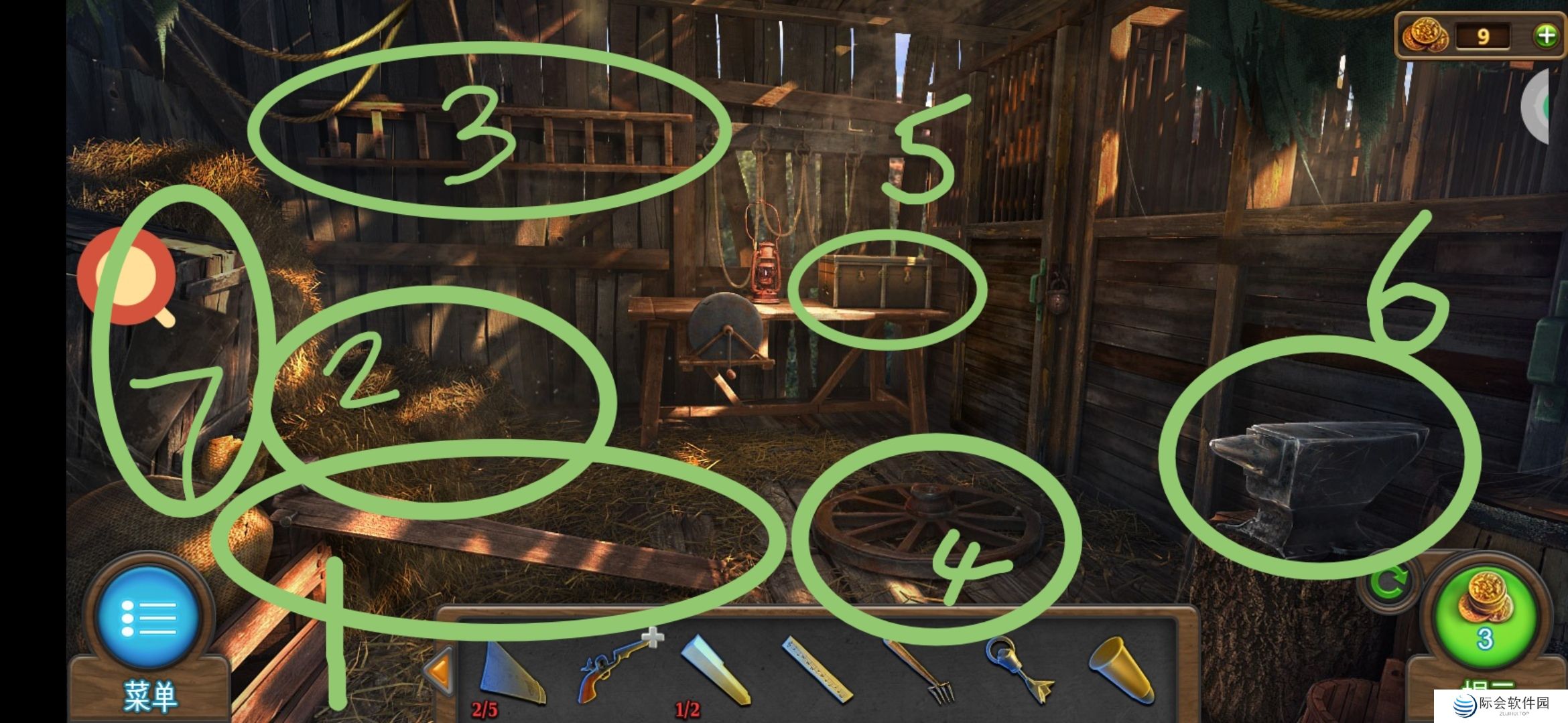 4、在椅子上、马车旁分别获得一枚风力发电机叶片1/5。马车旁获得叉子。水槽小场景获得钥匙。点击左侧门进入第三场景。