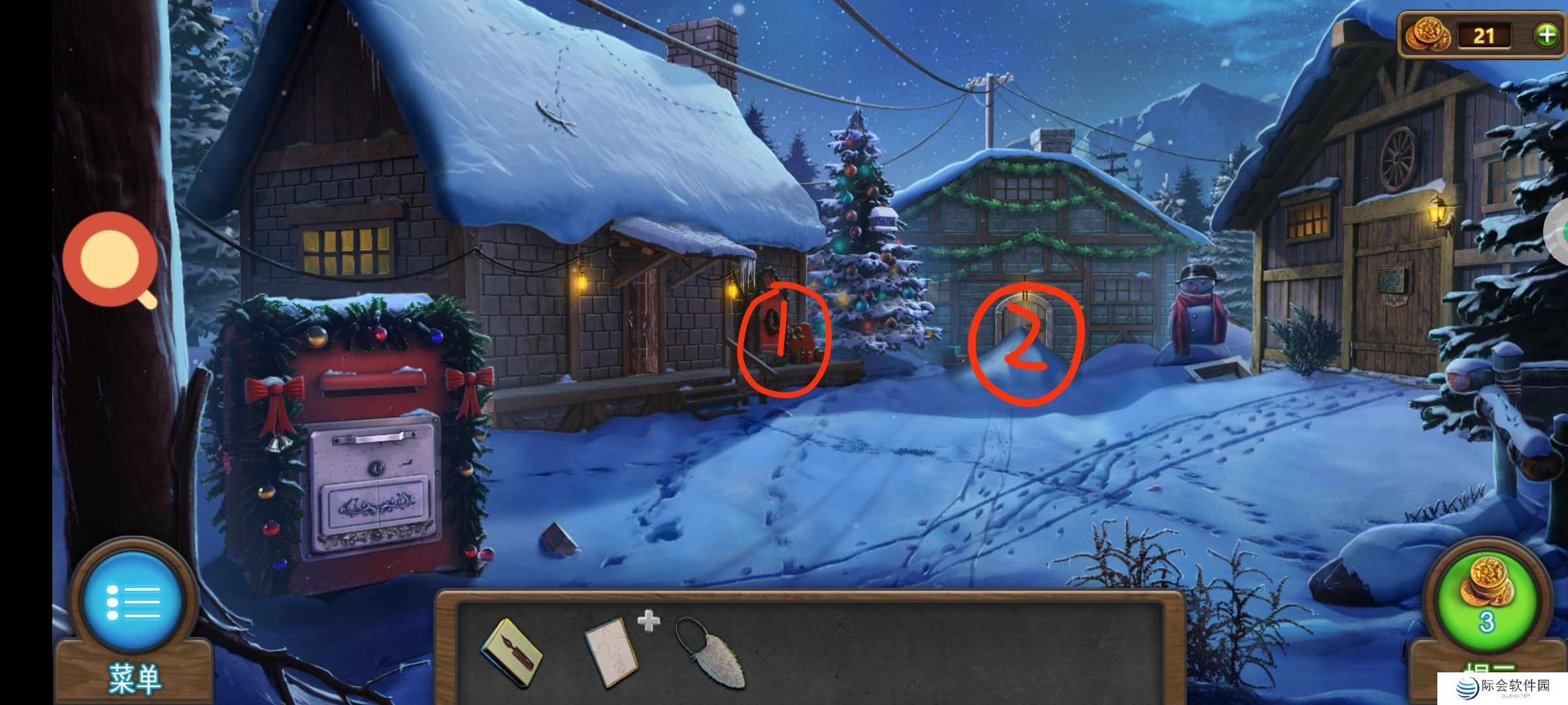 ❷红圈2处用铲子铲开雪,解锁场景:礼物房。
