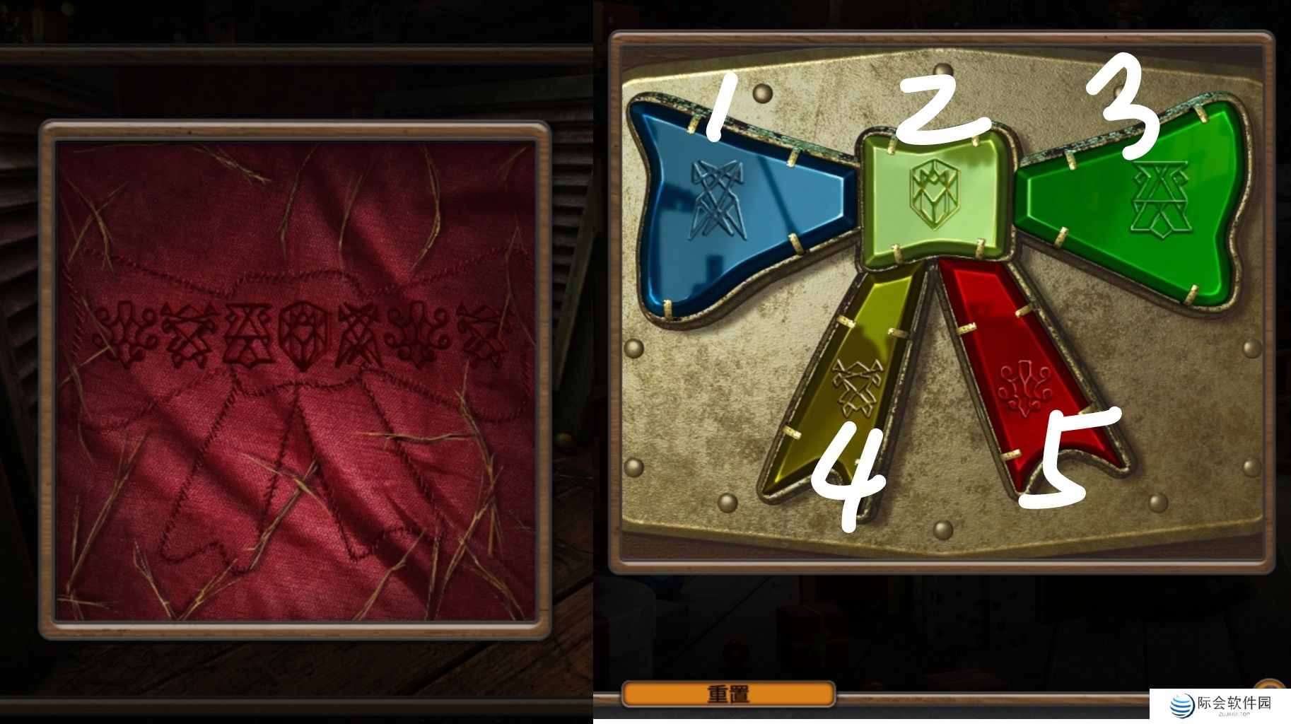 ❸红圈3处使用金属丝,完成小游戏(相同颜色是同一块)得到:①书1,②雕刻好的小雕像。