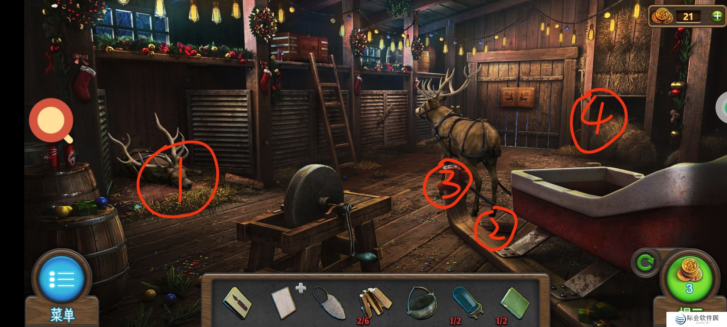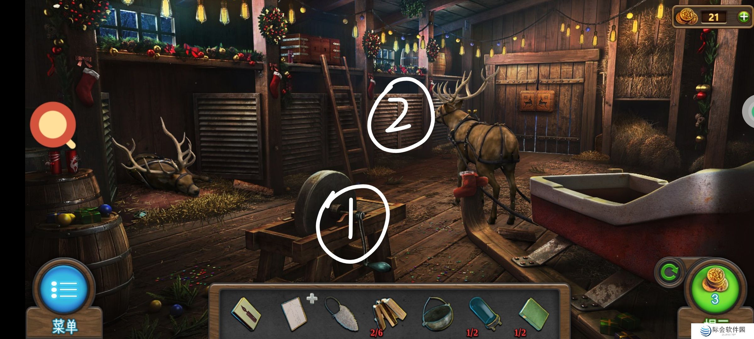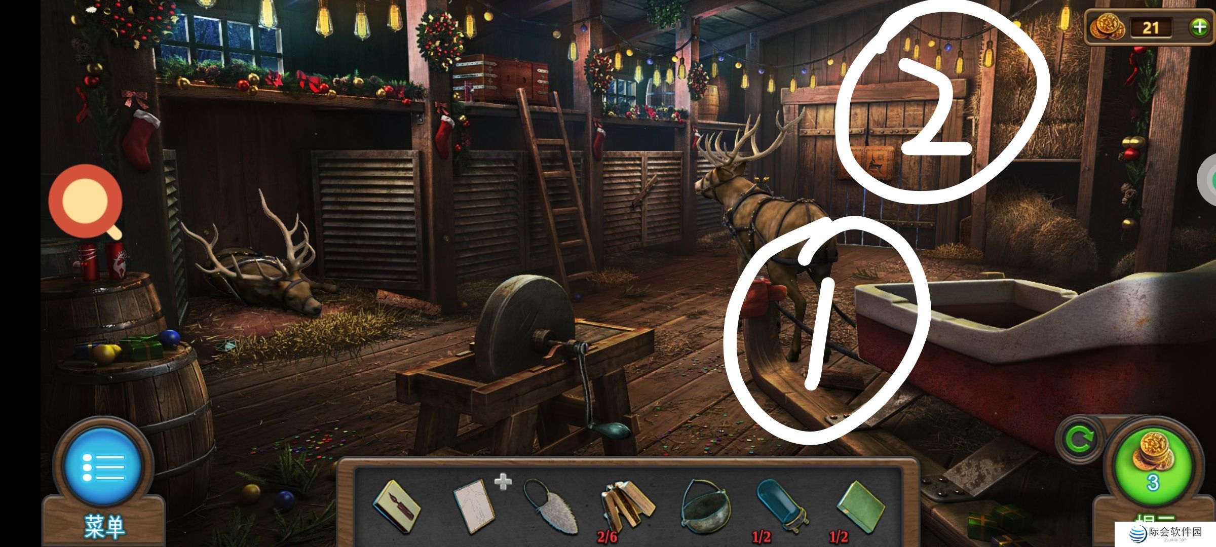 ❷白圈2处使用驯鹿小雕像,完成小游戏,通关。