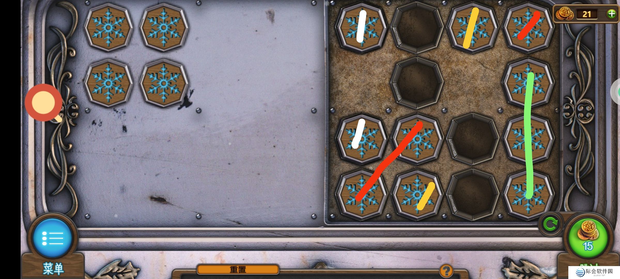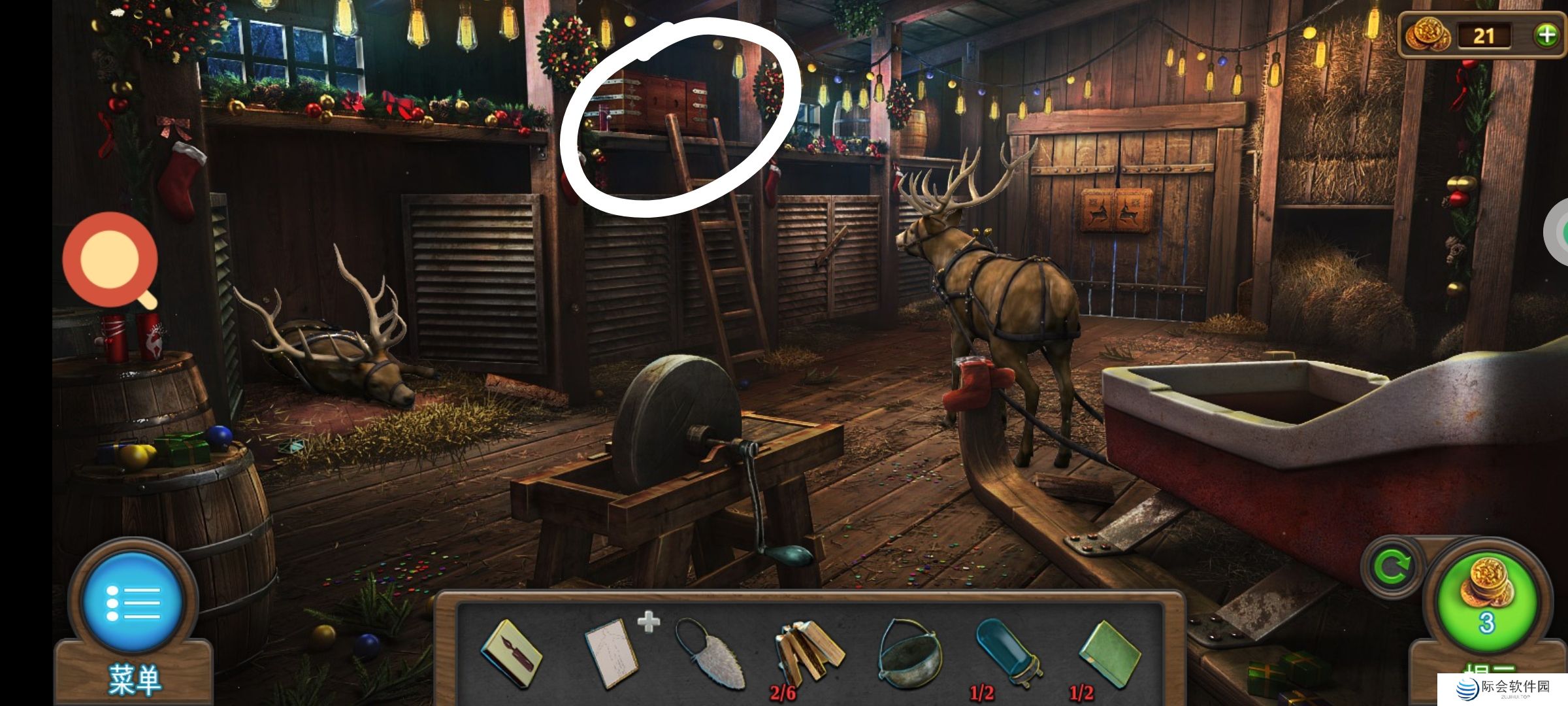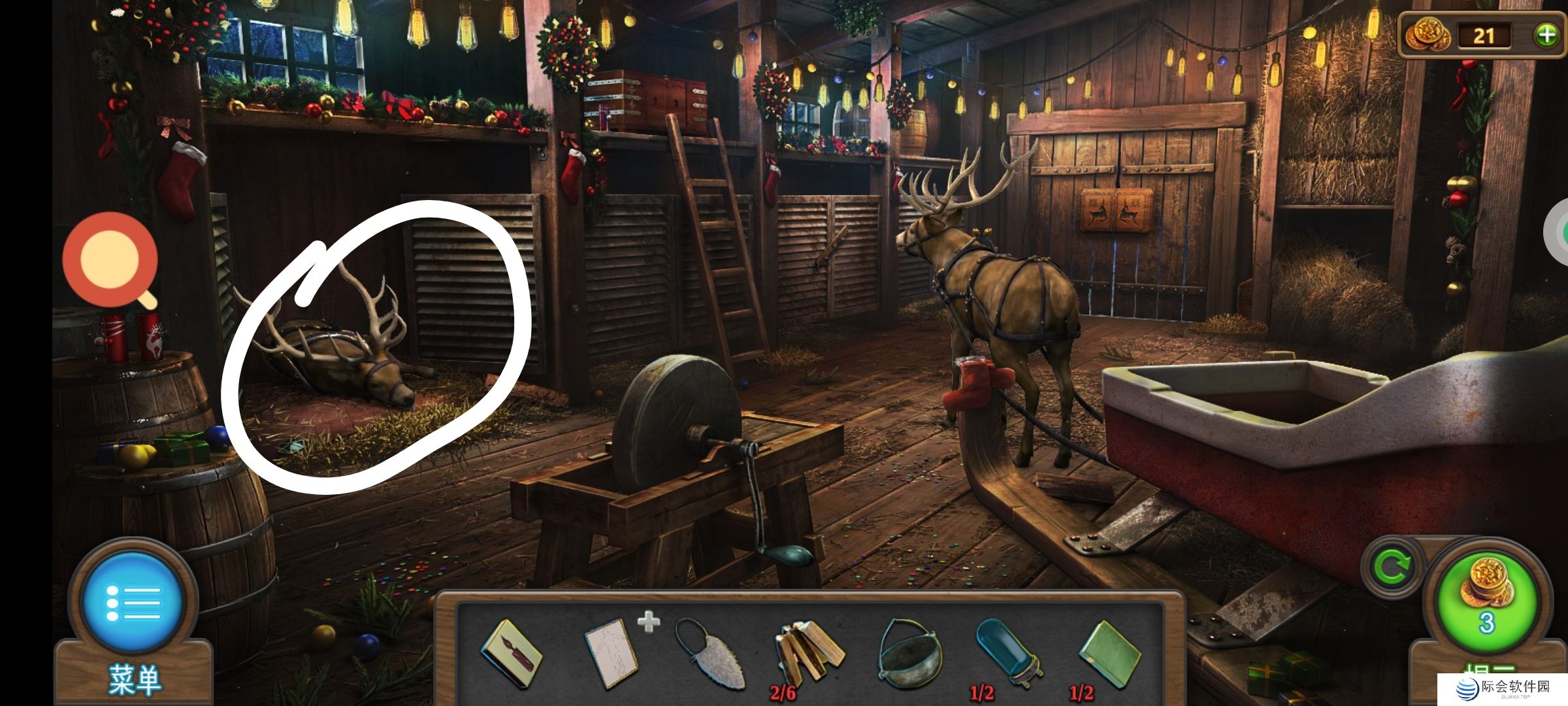 ❷白圈2处使用驯鹿小雕像,完成小游戏,通关。