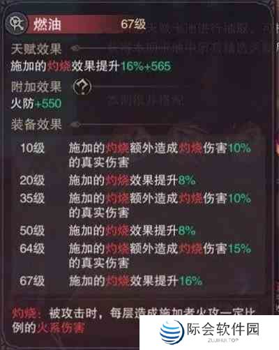 9.燃油:可提高灼烧效果并让被灼烧者受到伤害时附加一定量的真实伤害(满级灼烧效果+54%,附加真实伤害+35%)