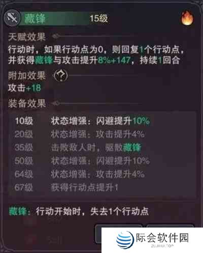 6.藏锋:行动时,行动点为0则回复两点行动点,并获得藏锋亮锋和闪避+20%一回合击,败敌人可清除藏锋状态(亮锋:增加攻击力,藏锋:下回合减少一点行动点)