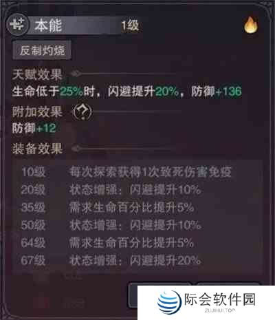4.本能:生命低于25%时提高闪避20%和防御(满级时闪避可提高到60%)