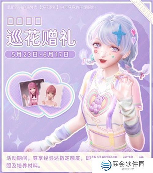 5月23日至6月17日,“巡花赠礼”限时活动开启。活动期间,玩家尊享经验到达指定额度即可获得巡花的赠礼;累计尊享经验达0,赠礼含幻之券及金币;累计尊享经验达60,赠礼含闪耀单品“梦光信号”,幻之券、金币;累计尊享经验达120,赠礼含闪耀单品“稚趣拼图”,星钻以及海量设计师之影培养材料;累计尊享经验达180,赠礼含限定滤镜“海滨晨雾”及光照“旖旎夜色”。