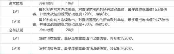 游戏中某角色的技能效果及其不同等级的差异。从通常技能到必杀技能,再到旗舰和支援技能,每个技能的冷却时间和效果都一目了然。特别是旗舰技能的常驻效果,能够为舰队带来显著的命中加成,并消除T字劣势。对于玩家来说,掌握这些技能的运用时机和组合,将大大提升战斗效率。