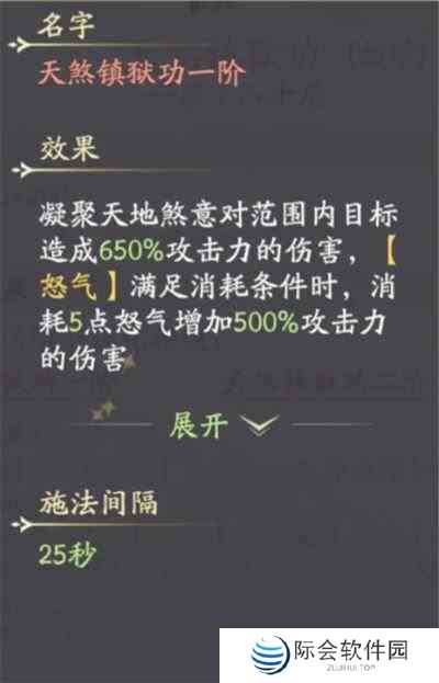 技能介绍:凝聚天地煞意对范围内目标造成650%攻击力的伤害,【怒气】满足消耗条件时,消耗5点怒气增加500%攻击力的伤害。