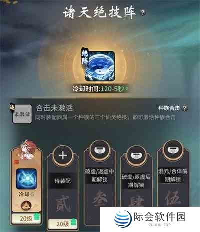 1、诸天绝技阵目前有五个阵眼可以设置仙友绝技,需要仙友达到六阶,也就是要用本体升级一次。