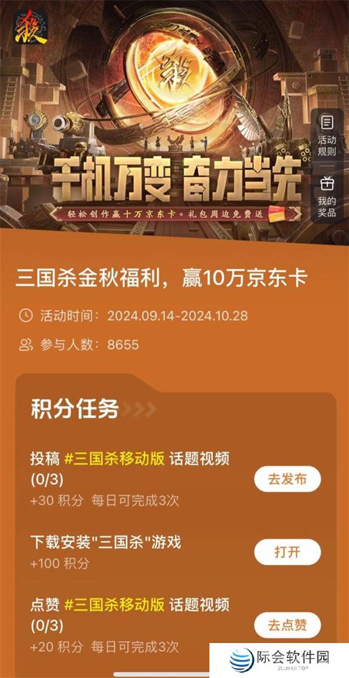 三国杀金秋福利仍在进行中,9月14日-10月28日,抖音玩家视频征集活动限时开启,完成签到、转发、点赞等任务即可获得积分!积分换好礼,10万京东卡、周边福袋(CD机、发声公仔、卡牌、卡牌垫等随机掉落)、游戏礼包等你来!