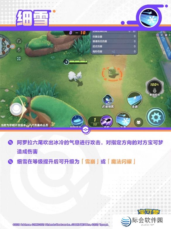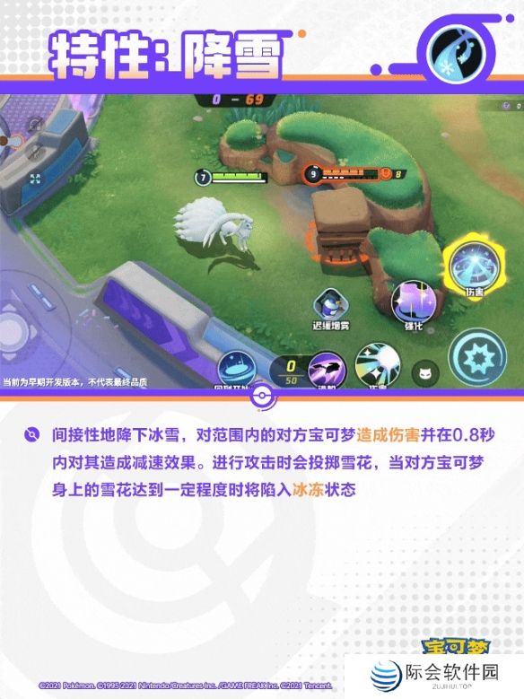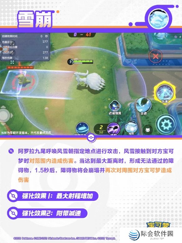 间接性地降下冰雪,对范围内的对方宝可梦造成伤害,并在0.8秒内对其造成减速效果。