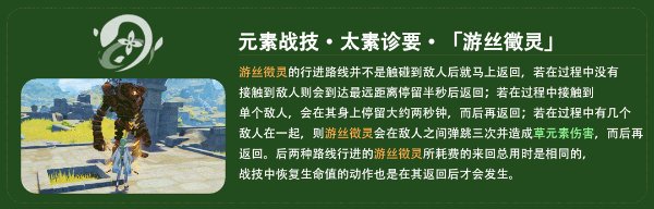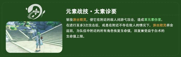 元素战技往前方驱役游丝徵灵并在三名敌人之间弹跳造成草元素伤害,并在回归角色身上时给全队角色恢复生命值,该天赋为白术获取元素能量的主要来源,且恢复的生命值也较高,可以和元素爆发一同升级。