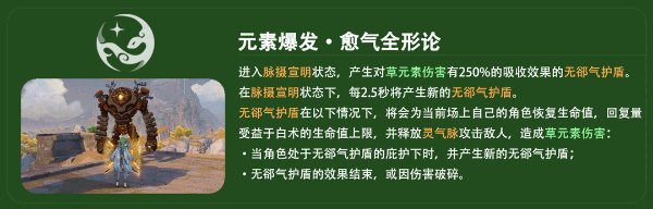 施放元素爆发会生成一个时间较短、血量较低且对草元素伤害有250%吸收效果的无郤气护盾,并且在元素爆发持续时间内每2.5秒都会产生新的护盾。这个护盾在破碎时、当前无郤气护盾存在时因2.5秒而生成新的护盾时会治疗场上自己的角色,并释放灵气脉对单个敌人造成草元素伤害。需要注意的一点是这两点情况需要理清楚,若是护盾因伤害破碎后提供了治疗和灵气脉攻击,下一次生成无郤气护盾时并不会再次对角色治疗和释放灵气脉,以此类推。