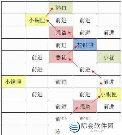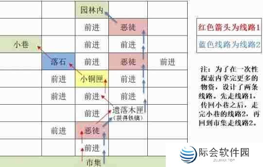 4、市集:前进-击败恶徒(红)-遗落木匣(获得铁镐)-前进-小铜匣-落石-小巷-击败恶徒(蓝)-遗落木匣(获得铁镐)-恶徒-恶徒-园林内