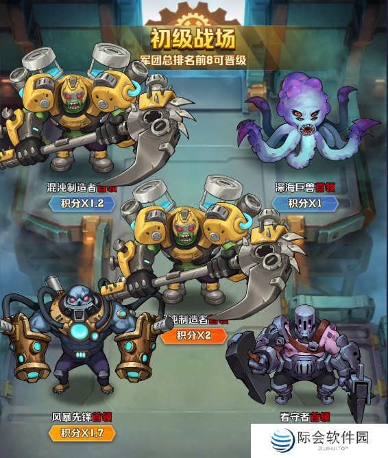 2、备战时有个倒计时,倒计时结束后就可以正常挑战(每轮会有两次的挑战次数)总共分为:初级、中级以及高级三个阶段的战场(不同的战场积分的倍率都会不一样)同时会有五个板块,挑战这五个板块的怪物,所获得的积分倍率都则不同,实力够硬的话直接挑战积分最高的怪物,能将积分的倍率更大化,从而获得更大的积分,领取相应的奖励!