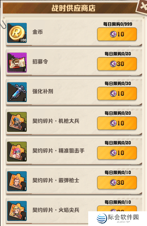 战时供应商店中优先兑换:换超时空军团碎片(每天五张)、金币、强化补剂,有剩余的才换招募令。