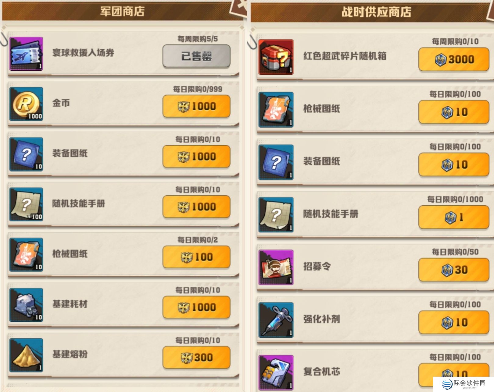 军团商店优先换:寰球入场卷(每周五张必换)枪械图纸、基建熔粉、基建耗材(防线等级拉满可不换)招募令、强化补剂、随机技能图纸。