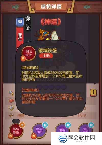 曹仁:血量550亿,大招铜墙铁壁,释放技能的效果是对随机3名敌人造成250%攻击伤害,同时为全体友军增加一个15%曹仁最天生命值的护盾。