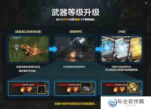 冒险家可以通过开启补给箱或者击杀岛上的恐龙等方式来获取武器的升级碎片和战斗道具,使用武器碎片升级自己的武器。