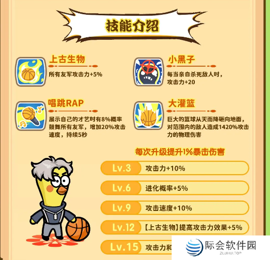 巨大的篮球从天而降砸向地面,对范围内的敌人造成1420%攻击力的物理伤害