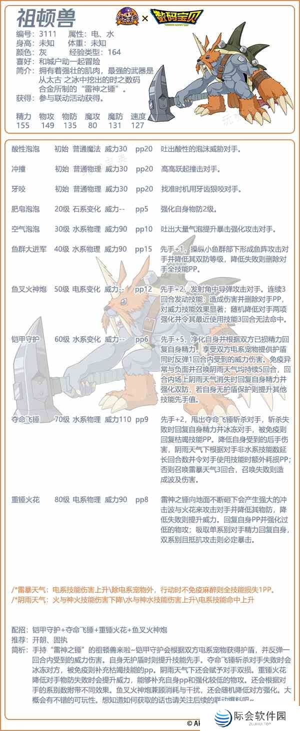5、阴雨天气下还会赋予对手双损,重锤火花降低对手物防失败时会提升威力,能够补充自身pp和强化较低的物攻。