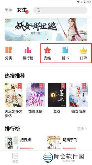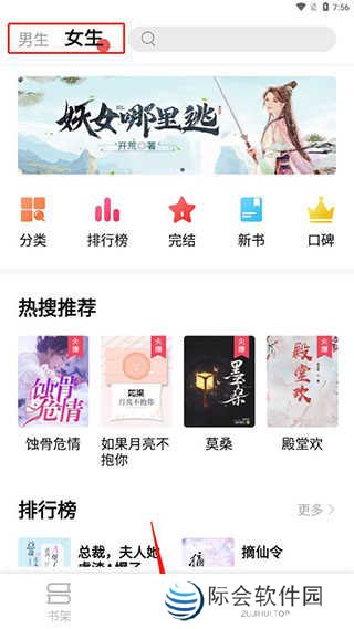 1、安装后打开在首页中可以看到精选男生和女生不同的分类,分别都有分类、排行榜、完结、新书、口碑等内容;