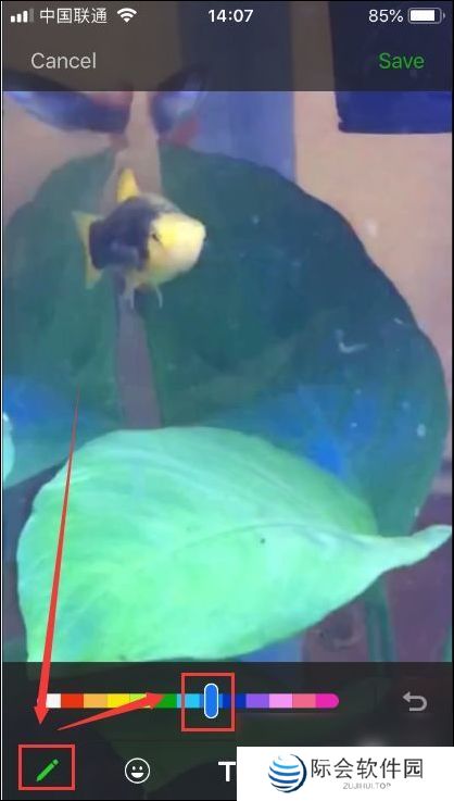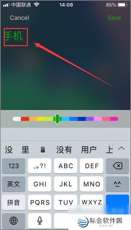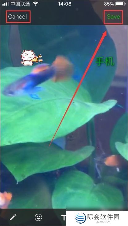 最终效果如图,在视频上面添加了一个表情包、两个字符,点击右上角的“Save”就能把视频保存在“相册”里面了。
