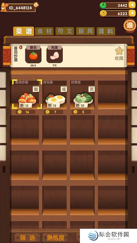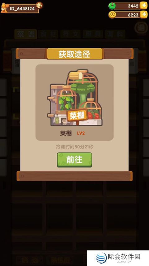 仓库:【仓库】界面展示了菜谱、食材、符文、厨具和调料等,玩家可以查看获取这些物品的途径和方法。