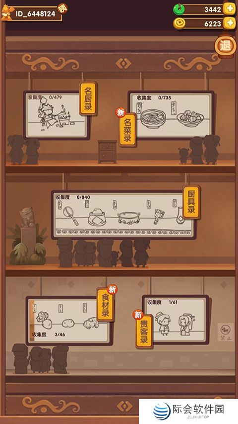 图鉴:在【图鉴】界面,可以查看【名厨录】、【名菜录】、【厨具录】、【食材录】和【贵客录】等内容,获取每项内容的详细信息。