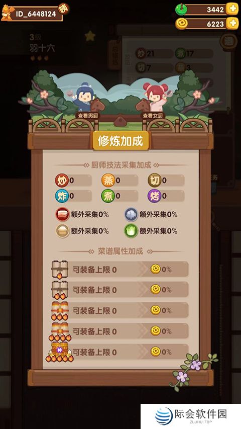 名厨录:在【名厨录】界面,你可以查看当前拥有的所有厨师,点击【总修炼】查看各厨师修炼后的加成属性,提升厨师的战斗力。